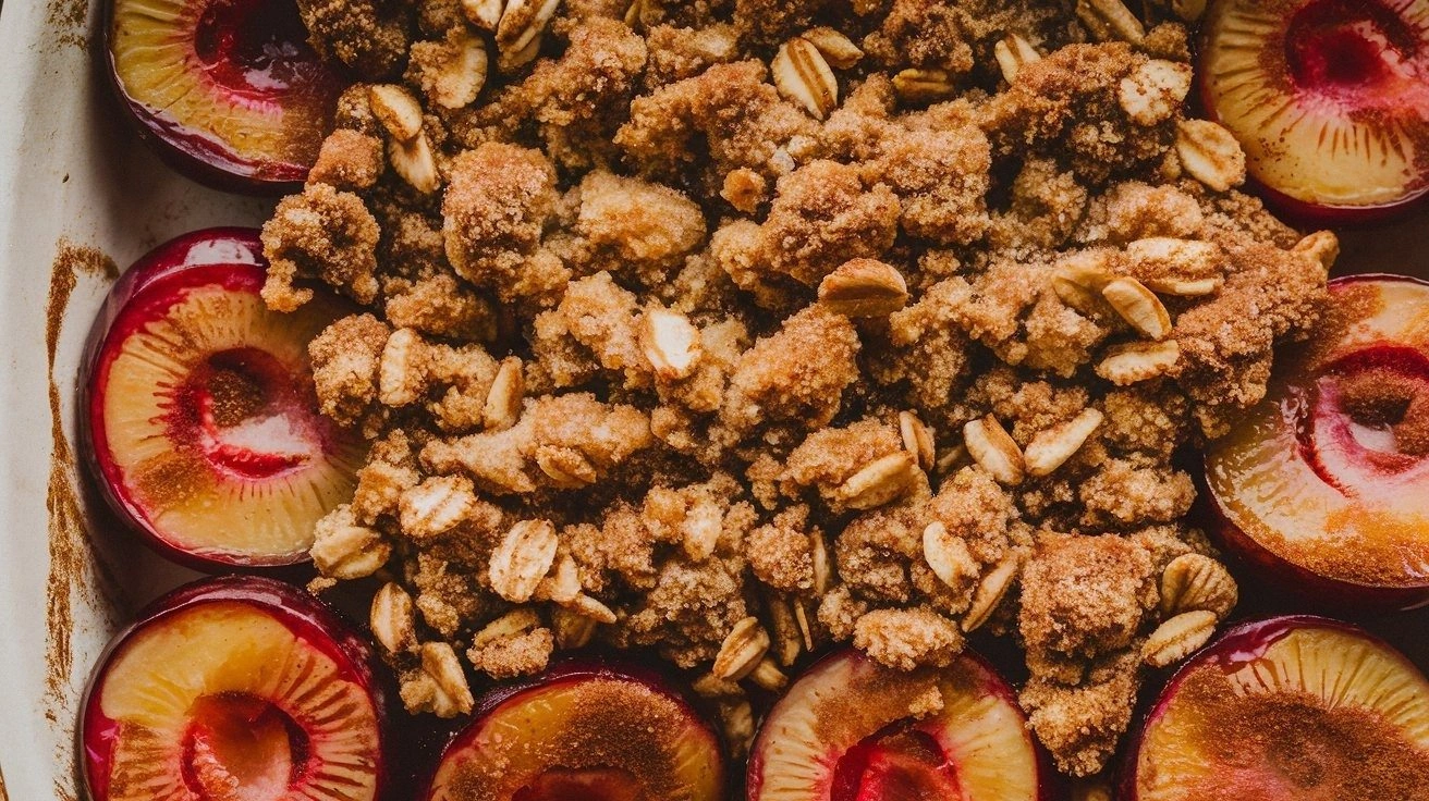 - Flavor: The plums are pre‑marinated with a splash of lemon juice and a whisper of vanilla, creating a bright, citrusy counterpoint that balances the deep sweetness of the fruit. The crumble itself is seasoned with cinnamon, nutmeg, and a touch of clove, giving it a layered spice profile that feels both comforting and adventurous.