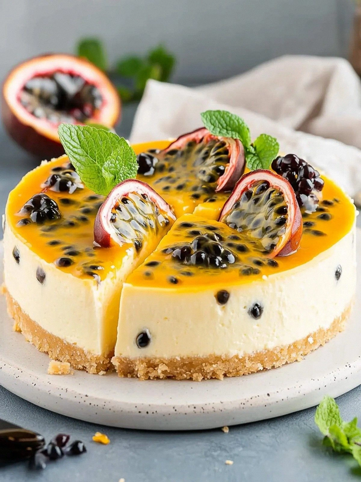 Swap half the passion fruit pulp for fresh mango puree. The result is a creamy, tropical cheesecake with a sweet, stone‑fruit undertone that pairs beautifully with coconut flakes on top. This version is perfect for summer parties.