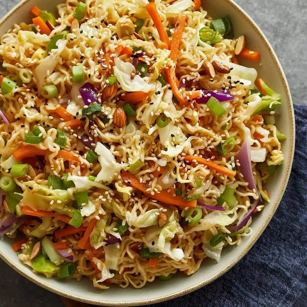 Fresh cabbage and carrots are the backbone of the salad’s crunch. Shredded cabbage offers a delicate, peppery bite that pairs beautifully with the sweet‑savory sauce. Carrots add a natural sweetness and a pop of color. The ramen noodles are the star of the show; they provide a chewy, comforting bite that contrasts with the crisp vegetables. To keep the noodles from becoming soggy, cook them just until al dente, then plunge them into ice water to halt the cooking process. If you prefer a softer noodle texture, you can cook them a bit longer, but the dish’s signature crunch will be compromised.