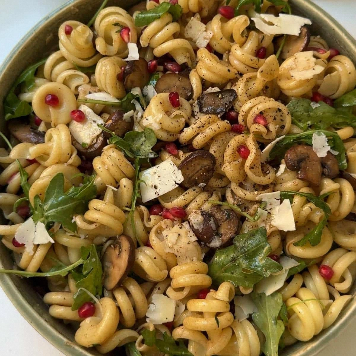 - Add the Fresh Elements: Gently fold in the 2 cups of baby arugula, ½ cup of shaved Parmesan, and ½ cup of pomegranate arils. The arugula should remain crisp, and the pomegranate seeds should stay intact. If you want a more even distribution, use a large mixing bowl and toss slowly.